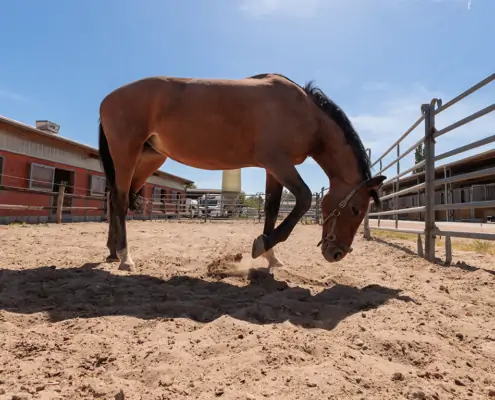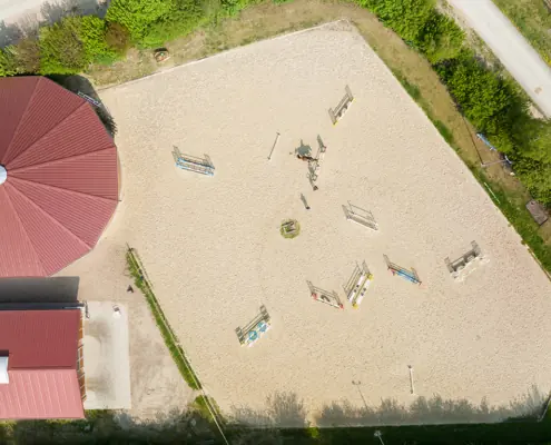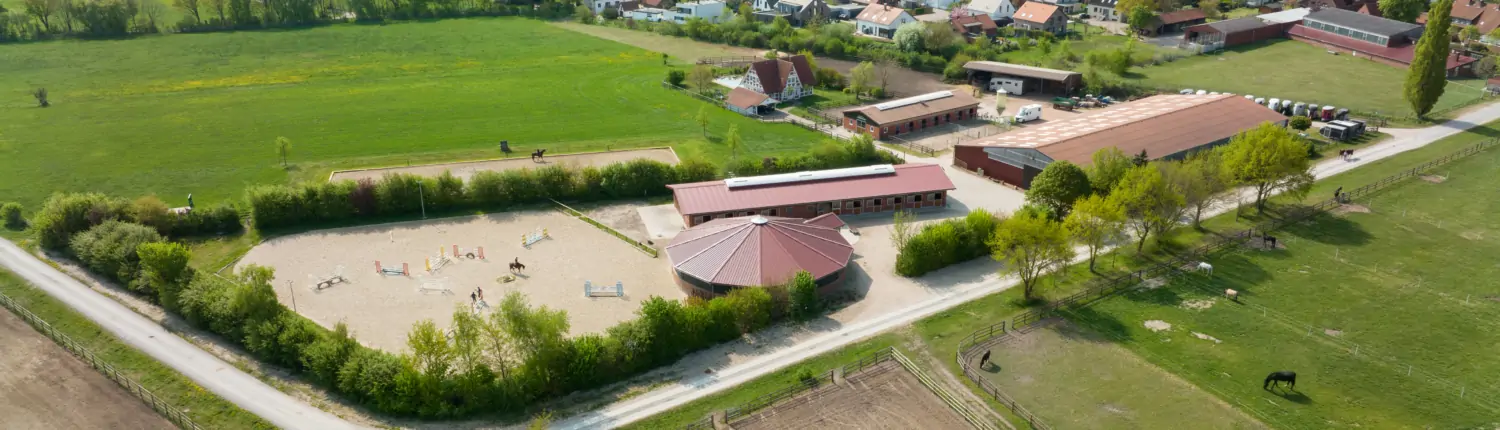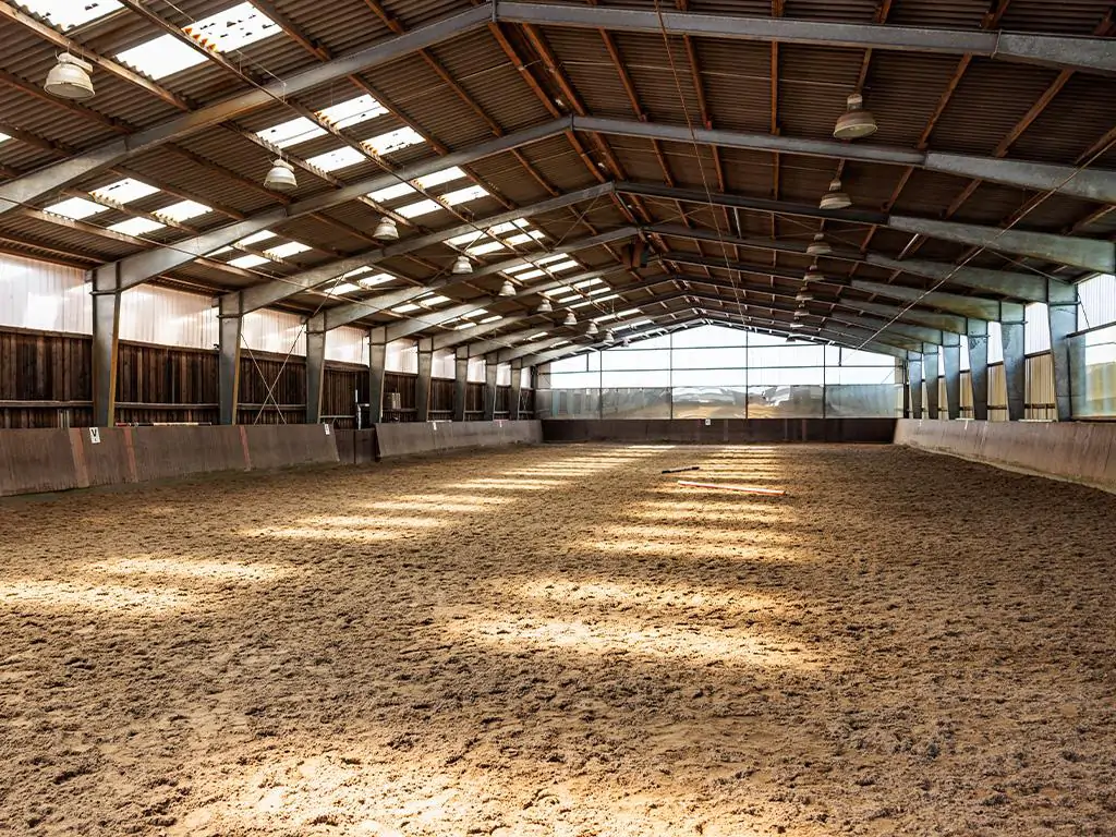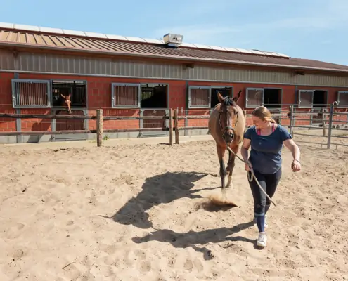 Zur Hofanlage gehören zwei Reithallen (20×40 Meter und 20×60 Meter), ein Dressurplatz (ca. 20×60 Meter) und ein großer Sandspringplatz (ca. 50×70 Meter) sowie eine Longierhalle mit Führanlage, die vielfältige Trainingsmöglichkeiten bieten. Erst 2021 haben wir die Führmaschine und die zugehörige Longierhalle gebaut, um Pferden und Reiter:innen noch mehr Trainingsvarianten anbieten zu können.