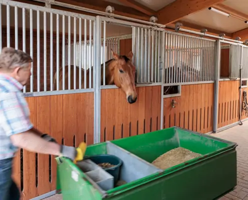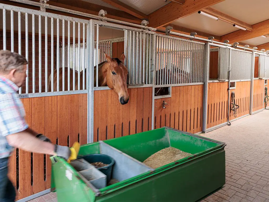 Auf unserem Hof werden die Pferde mehrfach am Tag mit hochwertigem Futter versorgt. Zum Teil erzeugen wir das Futter selbst: Wir bauen Heu und Stroh auf unserem zum Hof gehörenden landwirtschaftlichen Betrieb selber an.
